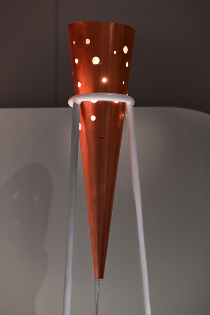 The conical diffuser gently rests within the circular insert, supported by three sleek legs, evoking the image of a paper cone. The varying-diameter holes create a lively interplay of lights, casting captivating patterns across the room.